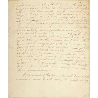 No place, no date (ca. 1809). 1 p. 9 1/2 x 8 in. (24 x 20.3 cm). Fragment, comprising p. ii of the introduction from "A History of New York": "In this arduous undertaking, which has been the whole business of a long and solitary life...In the conduct of this inestimable work, I have adopted no individual model, but on the contrary have simply contended." Sheet trimmed, silked, edges spotted and darkened; tipped into paper folder; in full brown morocco fall-down-back box. Including correspondence between a previous owner Frank L. Pleadwell, Irving bibliographer William R. Langfeld, and collector George S. Hellman, ca. 1931-1934, regarding the composition of Irving's original manuscript, and the provenance of this particular leaf. Also including a copy of the same owner's letter to A.S.W. Rosenbach about MS. leaves in his collection, as well as pages from old catalogues describing other "History of New York" MS. leaves.