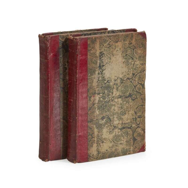 New-York: Printed by C.S. Van Winkle, 1819-20. Seven parts in two volumes. First edition, second printing of parts I, VI, and VII; parts II-V printed in 1820, and not in BAL or Langfeld and Blackburn. 8vo. Contemporary three-quarter red morocco, stamped in gilt, over marbled paper-covered boards, rubbed and worn, chipping to spine ends; all edges trimmed; tape repair at bottom gutter of pp. 75/76 in first volume, scattered spotting and foxing to text, moderate foxing at rear of second volume; scattered marginalia in each volume; book-plates of Lucy Wharton Drexel, Boies Penrose III, and David C. Titus in each volume, and book-plate of Wilhelms Monderse in second volume. BAL 10106 Bound with: (Halleck, Fitz-Greene) Fanny New-York: Wiley & Halstead, 1821. Second edition. Moderate foxing to text, scattered marginalia.
