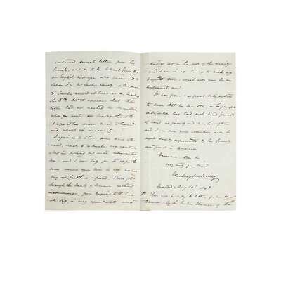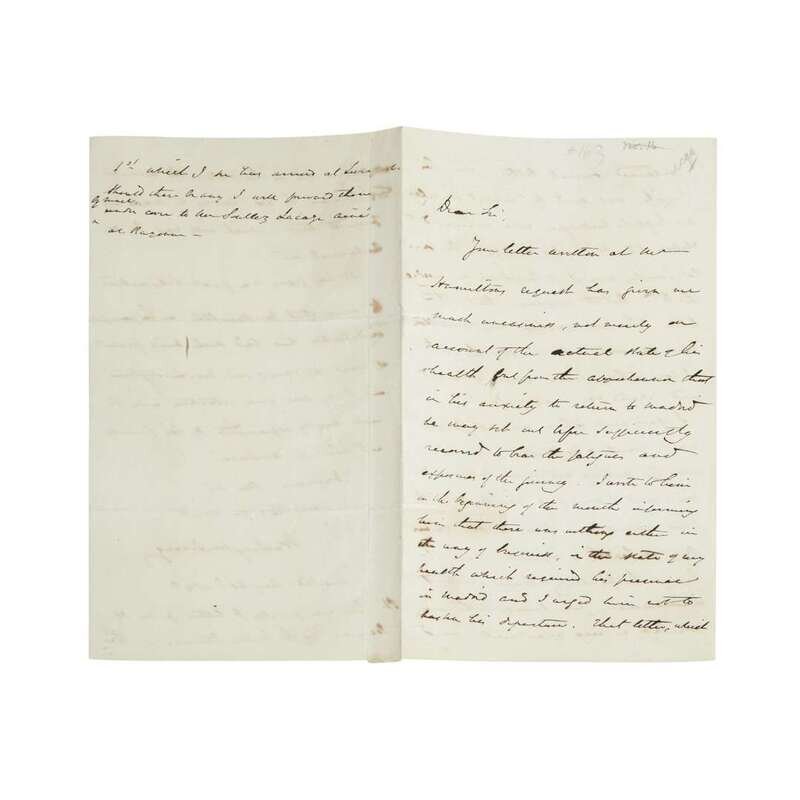 Madrid, August 20, 1843. 12mo. 4pp. Written by Irving while serving as U.S. Minister to Spain (1842-46) to an unnamed recipient, regarding the return of his secretary, Alexander Hamilton Jr. (grandson of Founding Father Alexander Hamilton). Irving expresses concern about Hamilton's health and urges caution about an early return to Madrid: "I again wrote to him some time afterward, mainly to reiterate my caution about his setting out on his return too soon: and I now beg you to urge the same council upon him in my name". Irving goes on to write about his improving health: "My own health is improved; I have got through the heat of summer without inconvenience..." Creasing from original folds, signature clear and strong.