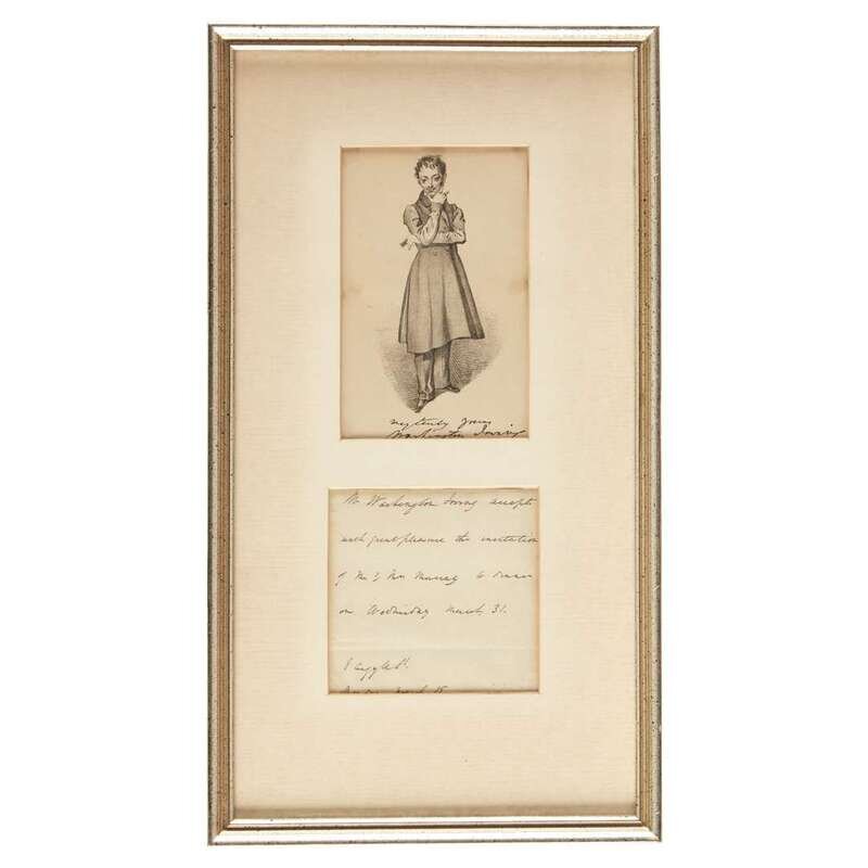 (London), 8 Argyle St, Monday March 15, no date. Autograph note, signed by Irving, presumably to his publisher John Murray: "Mr. Washington Irving accepts/with great pleasure the invitation/of Mr. & Mrs. Murray to dinner/on Wednesday March 31..." 16 1/8 x 9 in. (41 x 22.8 cm). In frame, with an engraved portrait of Irving.
