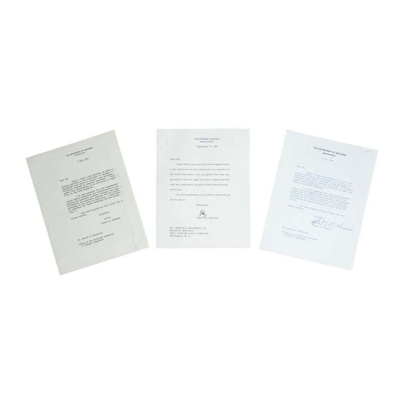 Kennedy, Robert F. Washington, D.C., September 2, 1964. 8vo. One sheet folded in half creating 4 pp. typed letter, signed by Robert F. Kennedy, to Edward L. Katzenbach, Jr., Deputy Assistant Secretary of Defense for Education and Manpower Resources, offering his gratitude for Katzenbach's work on an education committee. On Attorney General stationery, with Department of Justice blind stamp at top corner. Creasing from original folds, signature strong and clear. Together with: McNamara, Robert S. Washington, D.C., July 7, 1964. 8vo. 1 p. typed letter, signed by Robert McNamara, to Edward L. Katzenbach, Jr., Deputy Assistant Secretary of Defense for Education and Manpower Resources, accepting, with regret, Katzenbach's resignation from the Department of Defense. On Secretary of Defense stationery, with an additional, unsigned, onionskin copy. Creasing from original folding, signature strong and clear.