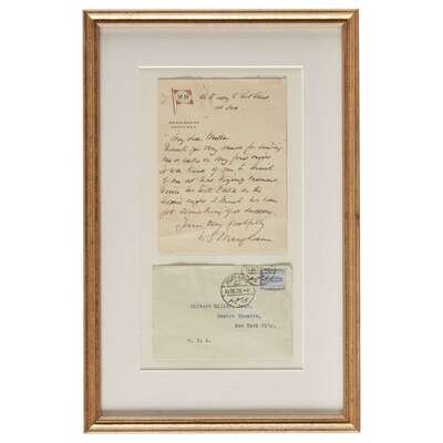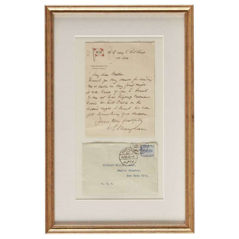 No place ("On the way to Port Said/at sea), no date (ca. 1920s). 1 p., on Messageries Maritimes stationary; with typed postal envelope with Port Said stamps . Inscribed by Maugham to Broadway theatre producer Gilbert Miller: "My dear Miller/Thank you very much for sending/me a cable on my first night./It was kind of you to think/of me at that trying moment./Since it took £404 on the/second night I think it has/got something/Yours very faithfully/W.S. Maugham". Minor creasing. In frame.