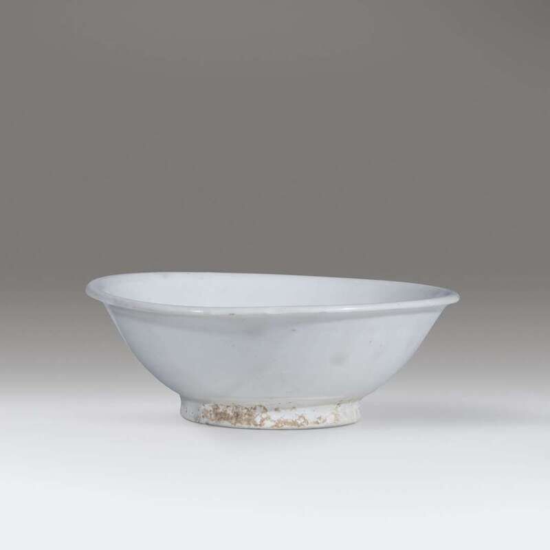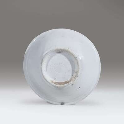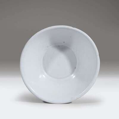 The flared bowl on circular foot, the lip slightly everted and subtley molded in five petal lobes, the soft white glaze pooling to slightly greyer tone.
