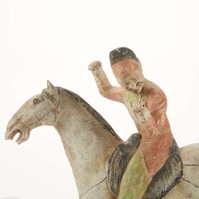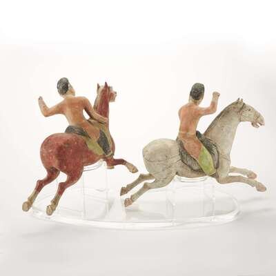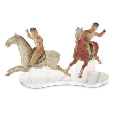 Each male rider with rounded cap mounted on a steed in full gallop, one arm raised to strike the ball; one on a white horse, with other arm raised; the other rider on a red horse, acrylic stand (2).
