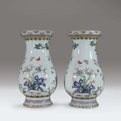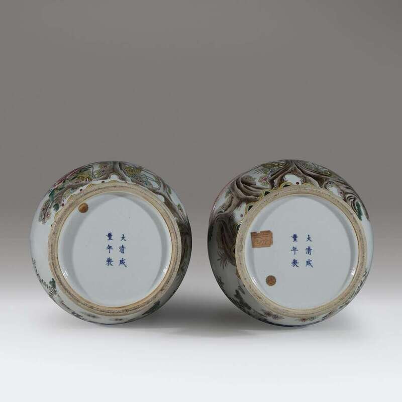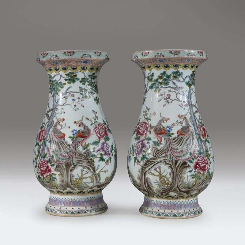A pair of Chinese famille rose-decorated "Phoenix and Flowers" baluster vases Xianfeng six-character mark and possibly of the period