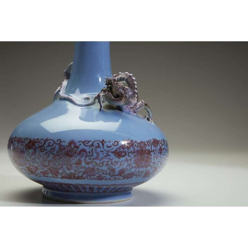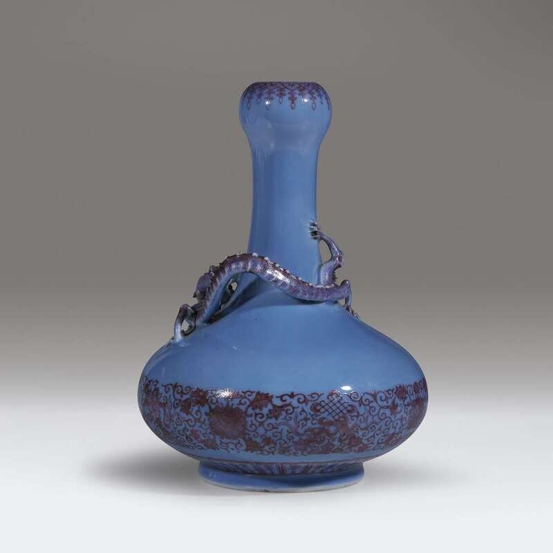 With a well-modelled sinuous drawon twined around the shoulder, a band of puce-enameled lotus-scroll and the eight Buddhist treasures, Ba Jixiang, at the waist, lotus lappets above the foot, ruyi heads and peandant beads at the mouth, underside with six-character Qianlong seal mark.