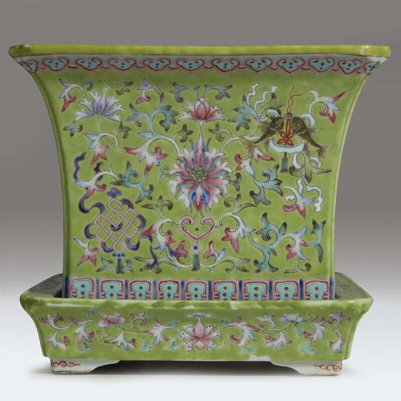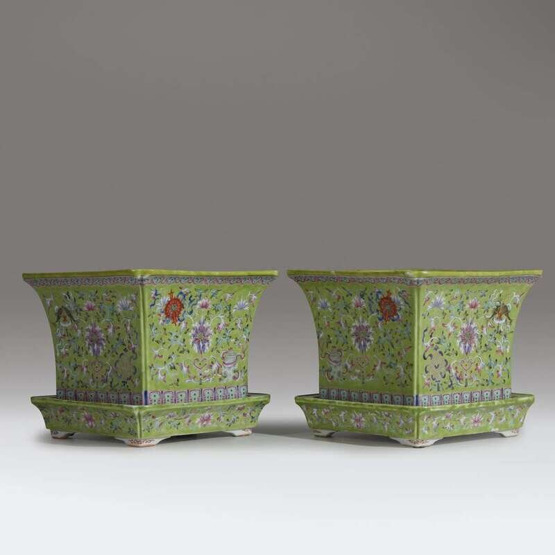 A pair of Chinese lime-green ground square jardinieres and stands Qing dynasty,19th century