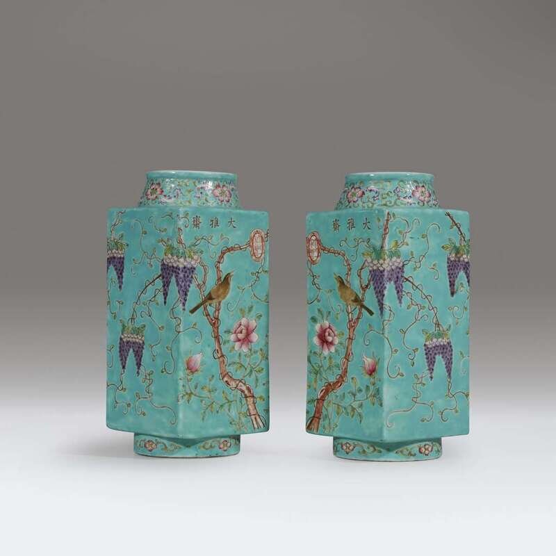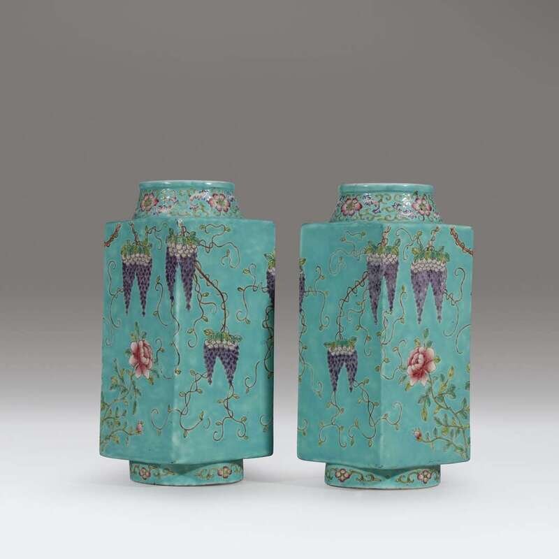 A pair of Chinese enameled porcelain “Dayazhai”-type cong-form vases 20th century