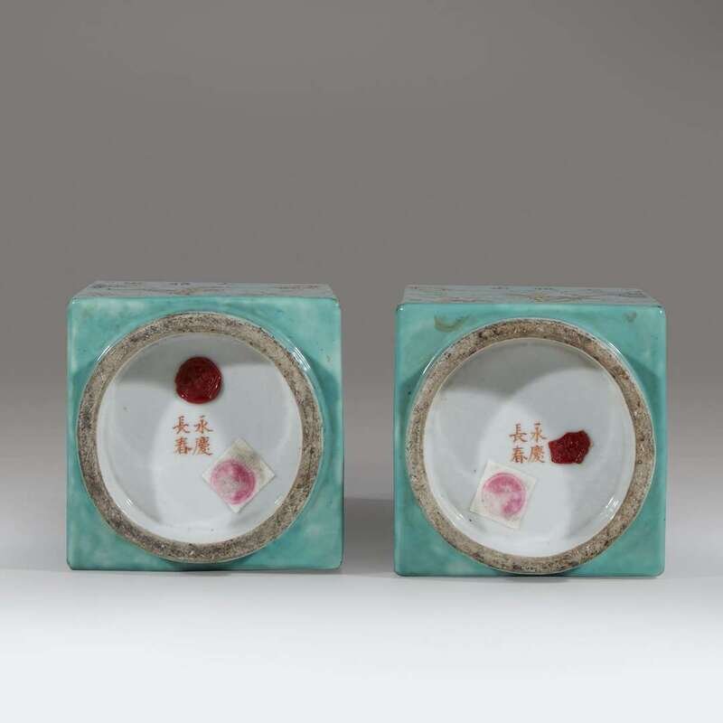 The complementary pair decorated with bunches of grapes, birds, and flowering branches against a turquoise ground, one side inscribed "Dayazhai" with seal, the underside inscribed with four character "Yong Qing Chang Chun" mark and applied wax export seal (2).