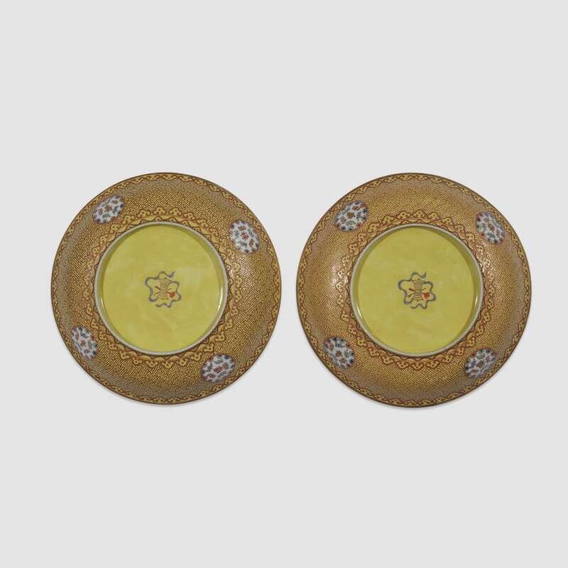 Finely decorated with gourd design, gilt-veined foliage and scrollwork, gilt ruyi-head border, exterior painted with "Fu Lu Shou Xi" characters in circular reserves with bats, against a yellow fret ground, underside with ruyi scepter and auspicious symbols (2). NOTE: Compare a related pair of smaller (6 3/4 in.) dishes, from an Asian private collection, acquired in Taipei in the 1980s, sold at Christie's Hong Kong (online), April 12, 2018, lot 10.