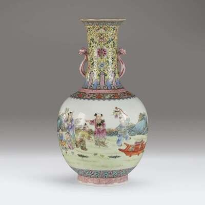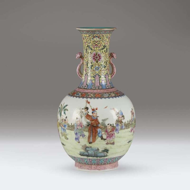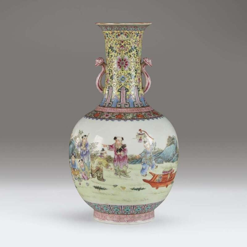 Decorated with various boys at play in a garden, with two ruyi scepter handles to the neck decorated with bats and Indian lotus and scrolls on a yellow ground, floral and key-fret band borders at the neck, underside with apocryphal Qianlong mark.