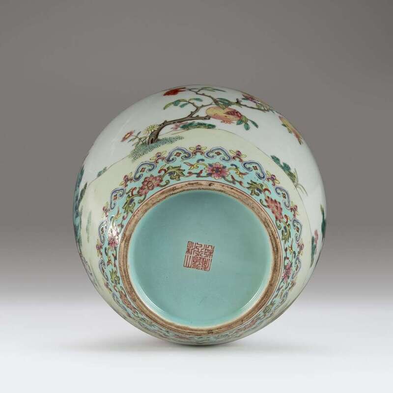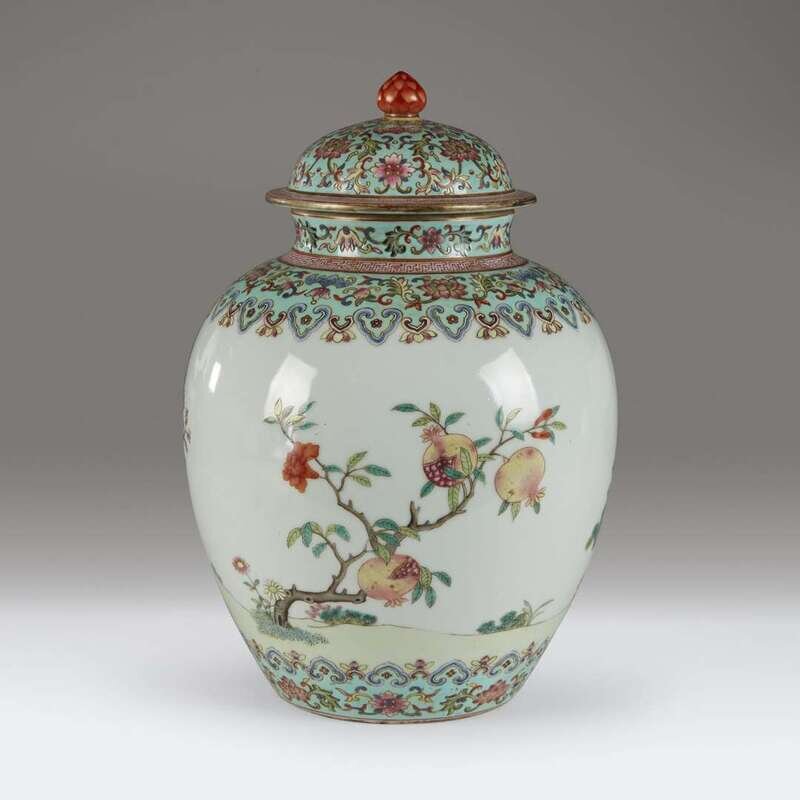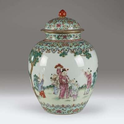 Decorated in bands of floral and "wan" patterns along the neck and shoulder, the body with boys playing in a garden landscape with a tree of pomegranates at the back, the cover with lotus and scrolling vines, "wan" border, underside with Daoguang six-character seal mark.
