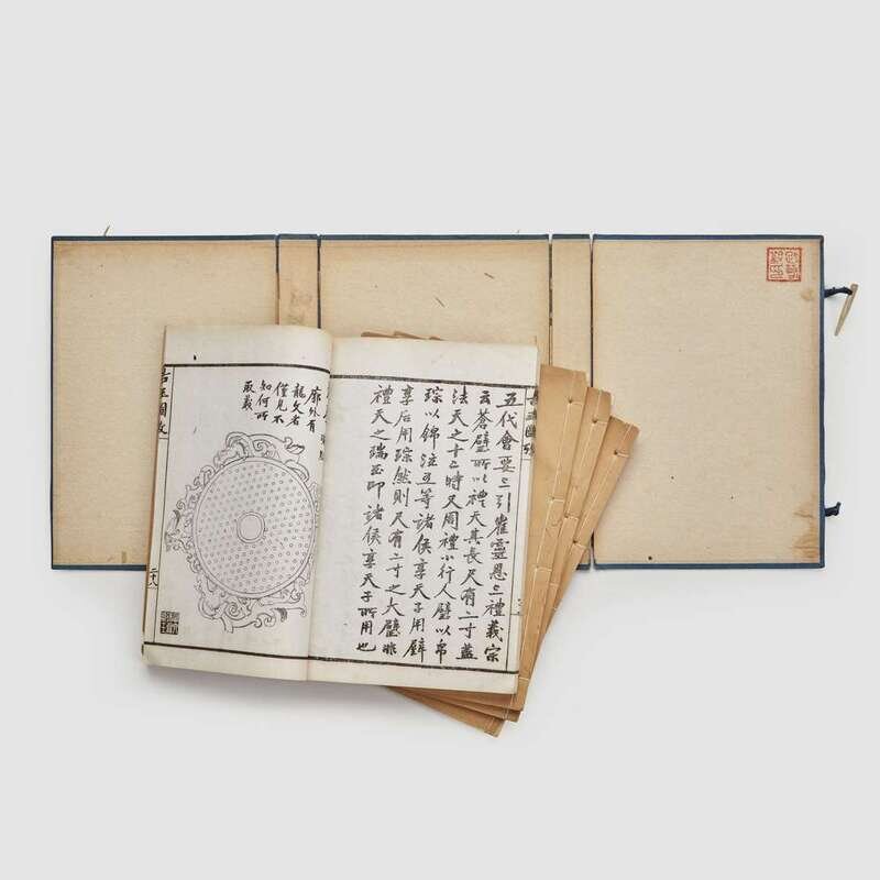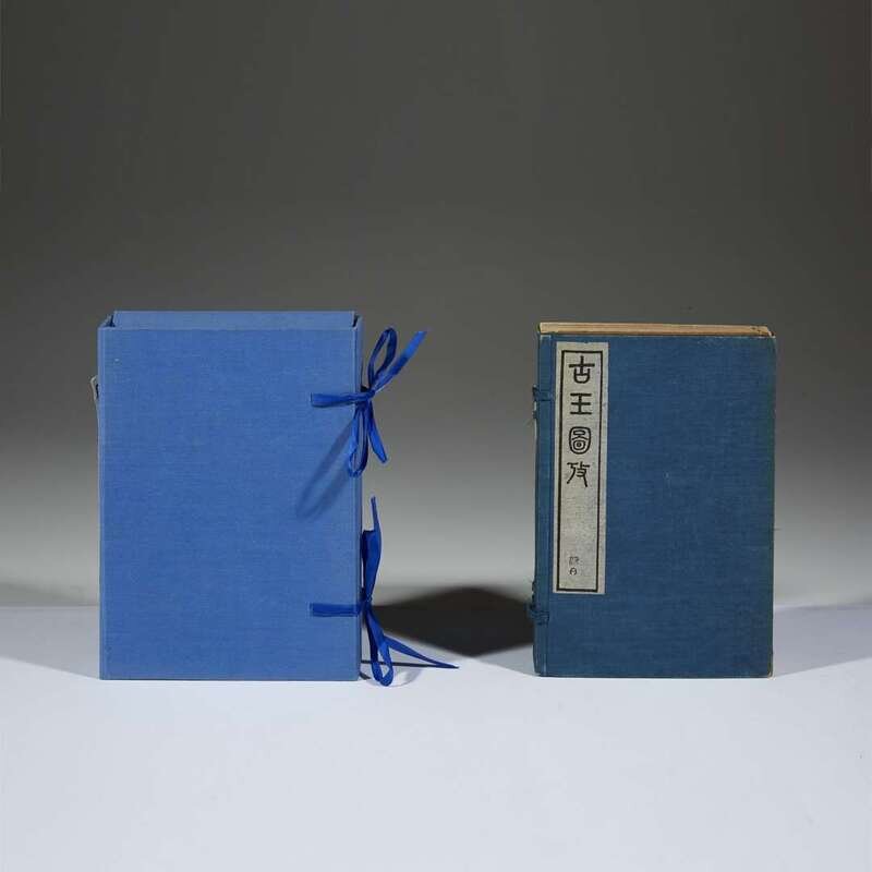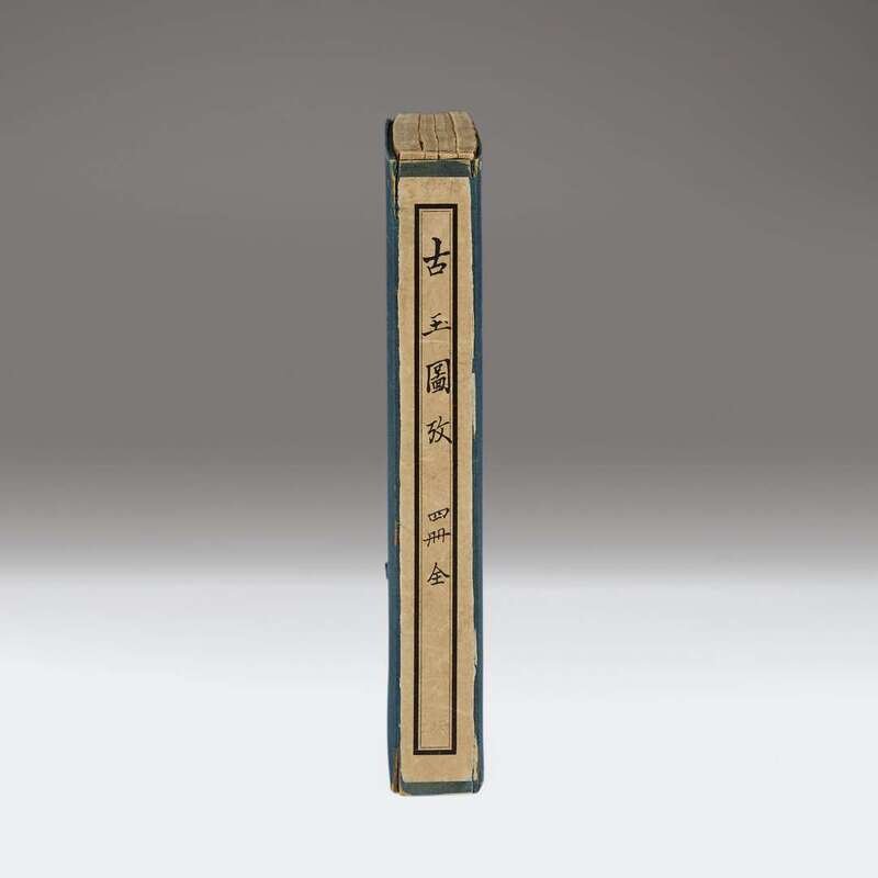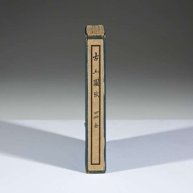 Wu Dacheng (1835-1902) 1st edition (later reprinted in 1919), printed lithographically in Shanghai by the Tongwen Bookshop in “the Jizhou year of Guangxu” (1889), all bound into four octavo volumes, sewn with plain brown paper covers bearing printed tissue title labels, and enclosed in the original blue cloth box with its front and spine labels. Including numerous line illustration of ancient jades. NOTE: The present volumes are among the most important Chinese contributions to the study of ancient jades prior to the 20th century. Another example of this work may be found in the Van Pelt Library at the University of Pennsylvania.