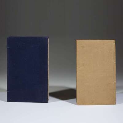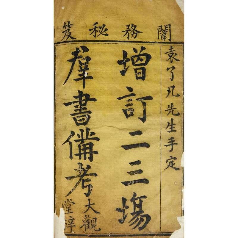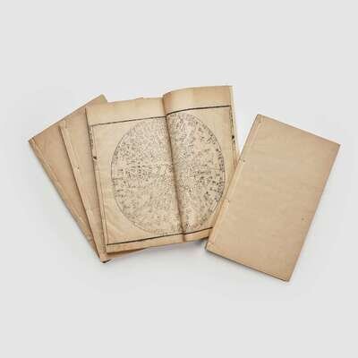 Text by Yuan Huang (1533-1606), with commentaries by his son Yuan Yen (1581-1627), supplemented and published by Shen Changshi in 1642, and printed at the Da Guan Tang (“Great View Hall”) as a private edition intended for internal administrative circulation (as opposed to popular distribution), printed in woodblock technique in four Juan, each stitch-bound in a separate volume of quarto size, the first of which with a customary yellow-dyed title page followed by a preface (printed in semi-cursive script) by Shen Changshi date the Renwu year of Chongzhen (1642), the 11th month; and the second and fourth juan printed with woodblock illustrations of a Star Atlas, an Armillary Sphere, an overall geographical map of China, and maps of the Yellow River, the Grand Canal, a Sea Transport Map, maps of Jiubian (“the Nine Boundaries”), Liaodong Territory, and the northern frontiers of Sizhou Territory, Xuan, Datong, Yulin, Ningxia, Guyuan, and Gansuan, as well as a map of Coastal Embankements. NOTE: According to the present owner, during the Qianlong period, the maps of the Northern Frontier were excised from the fourth juan. As the present lot includes maps of the territories of Datong, Yulin and Ningxia, this may be one of the few rare copies which retain the excised maps.