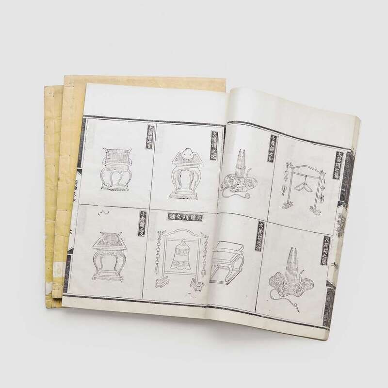 A recut of a Yuan dynasty version of a Song dynasty edition, the illustrations copied by Yao Chushi with calligraphy by Tao Shili of Moling, and carved by Peng Wansheng of Dangtu, printed as a private-collection edition of the Yi Xue Xuan (Pavilion of Arts and Studies) in the “6th year of Jiaqing”. In three folio volumes, with approximately 633 illustrations on 89 pages, with original gold-flecked yellow paper covers, later case. NOTE: The Er Ya, China's earliest-known dictionary is based on words found in the "Classics", and is now a part of the "13 Classics". According to the present owner, no other complete copy of this edition has been located in an American collecion.