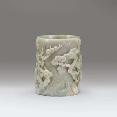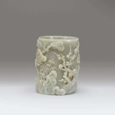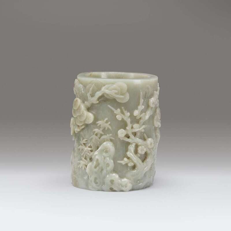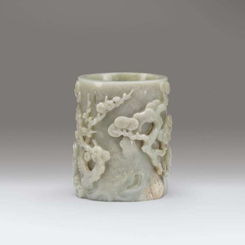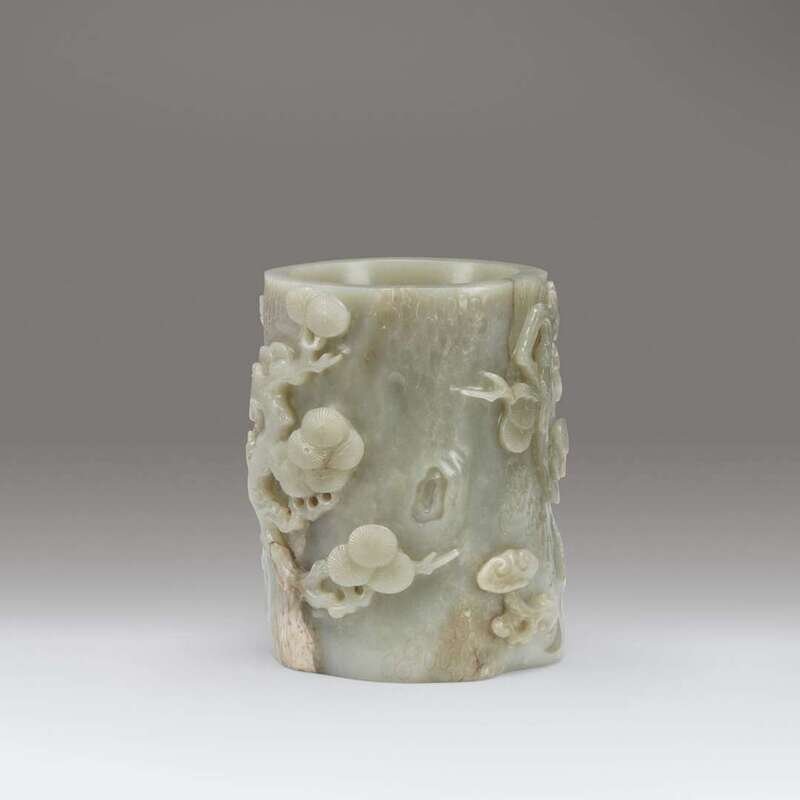 A Chinese carved celadon-grey jade brushpot Qing dynasty, 19th century or earlier