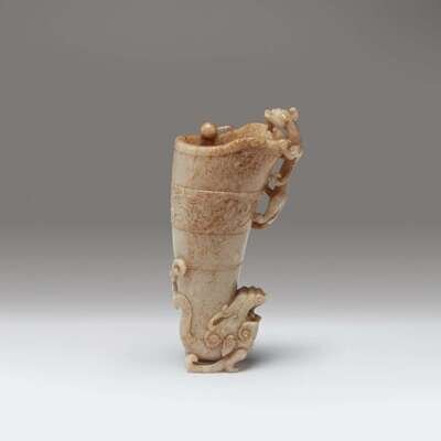 the well-hollowed vessel issuing from the neck of a qilong, the exterior decorated with taotie mask and archaistic scrolls, one side with a clambering qilong forming the handle, and another qilong in high relief on the body, a flaming jewel on the lip.