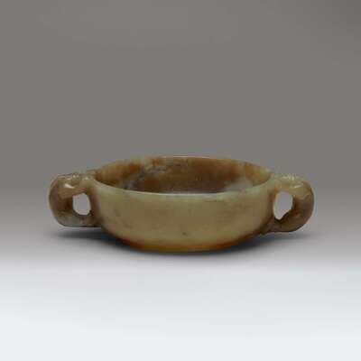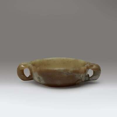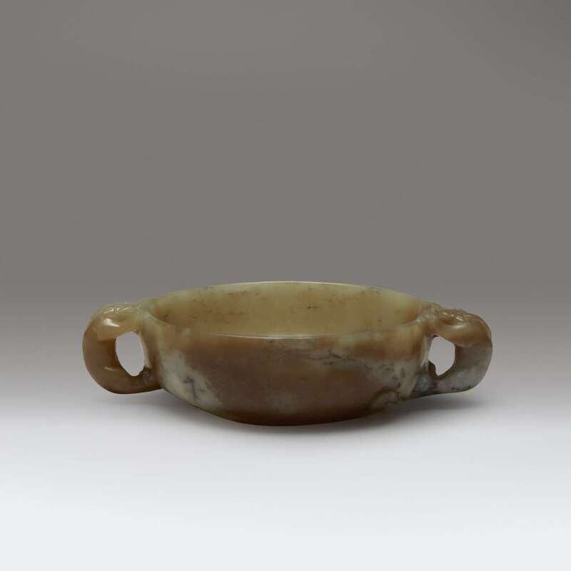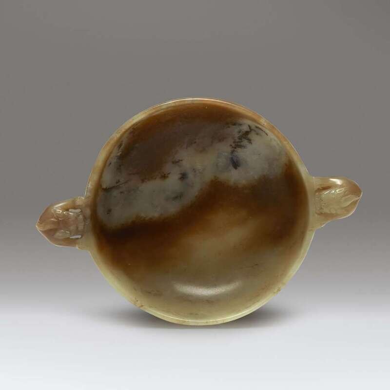 A Chinese carved yellow, beige, and grey jade circular two-handled libation cup late Ming/early Qing dynasty or earlier