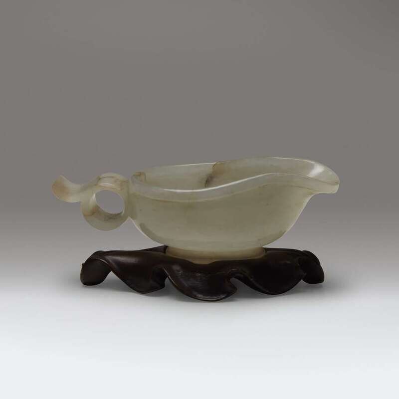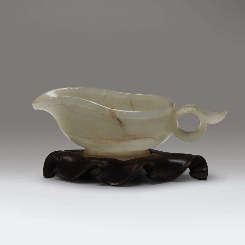 Carved with a wide spout and a flanged circular handle, the body with a light russet-tinged natural inclusion to one side, with a carved wood leaf-form stand.