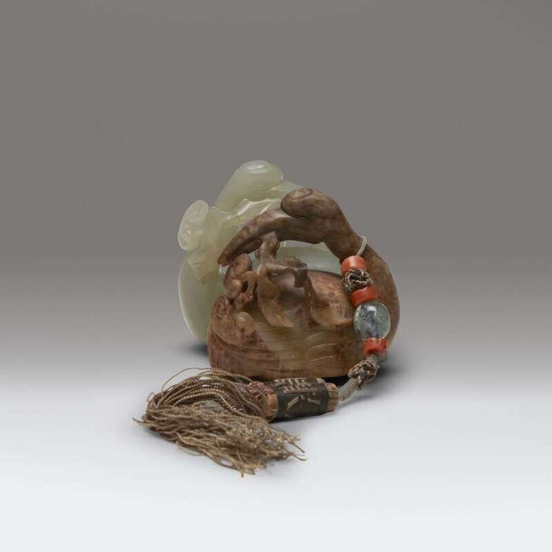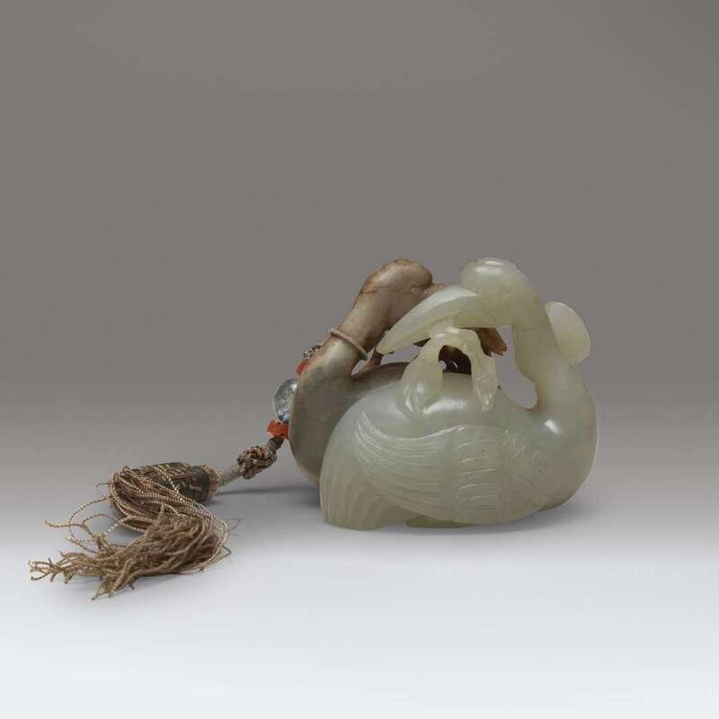One crane in pale celadon; the other in russet-brown, depicted in faced recumbent positions holding a branch of lingzhi between both beaks. With silk tassel attached decorated with coral and glass beads.