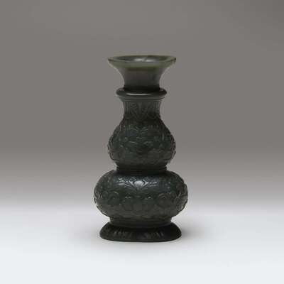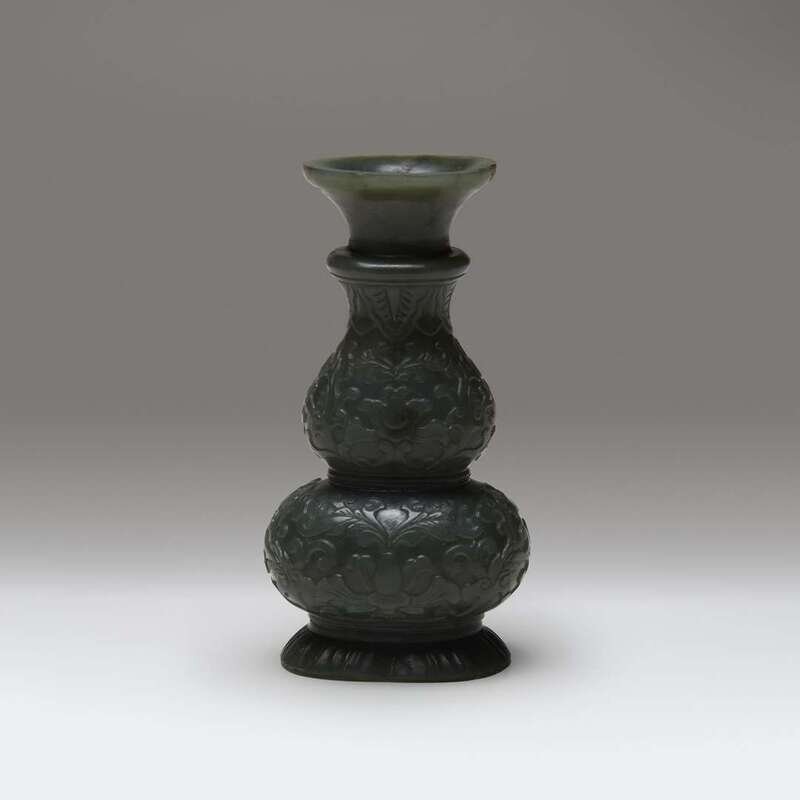 With a flared lip above a double-gourd body, the exterior carved in low relief with lotus scrolls, all raised on a domed foot; the stone of a very even spinach green.