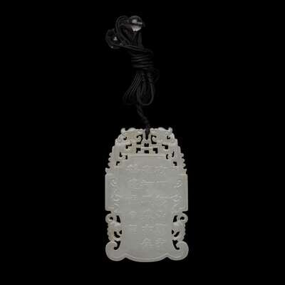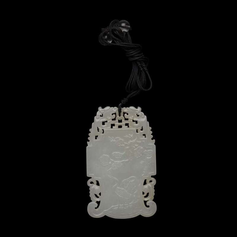 The face of one side carved in low relief with a pair of cranes beneath a flowering prunus, with a poem inscribed verso; the stone of an even white tone, carved to the outer edges with a pierced decorative border, tied with a braided black string threaded with two glass beads. .