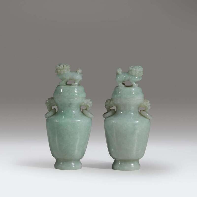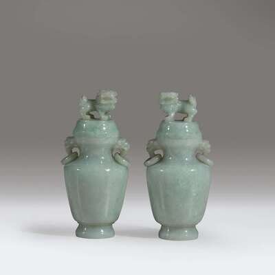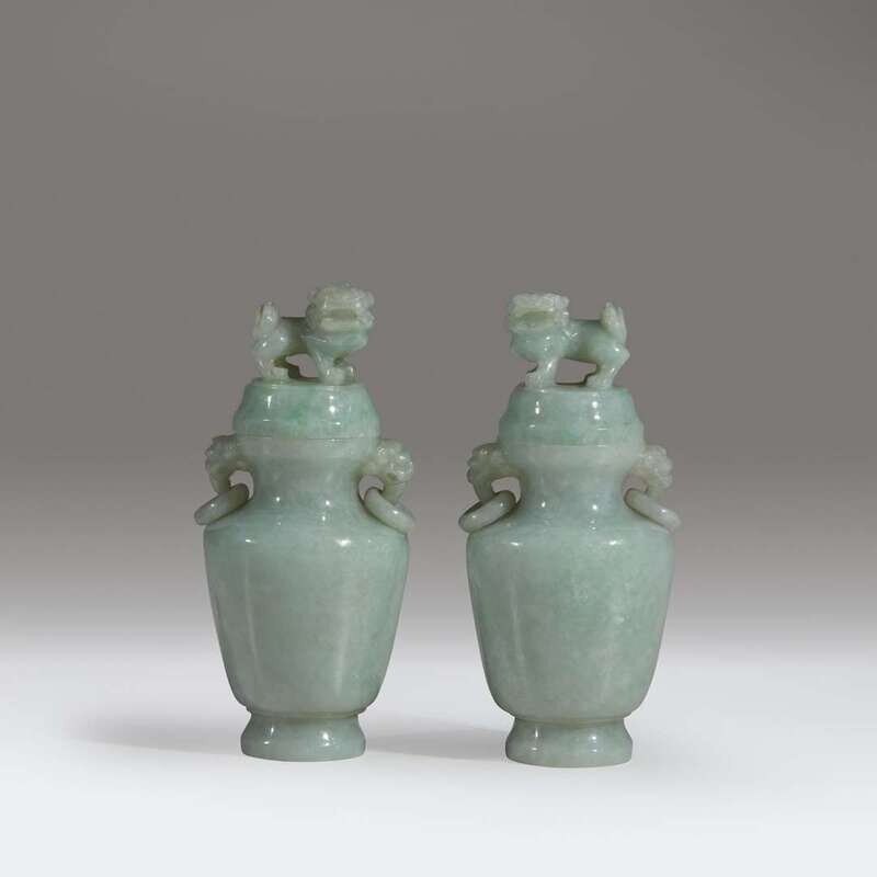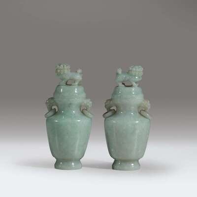 A pair of small Chinese pale green jadeite vases and covers