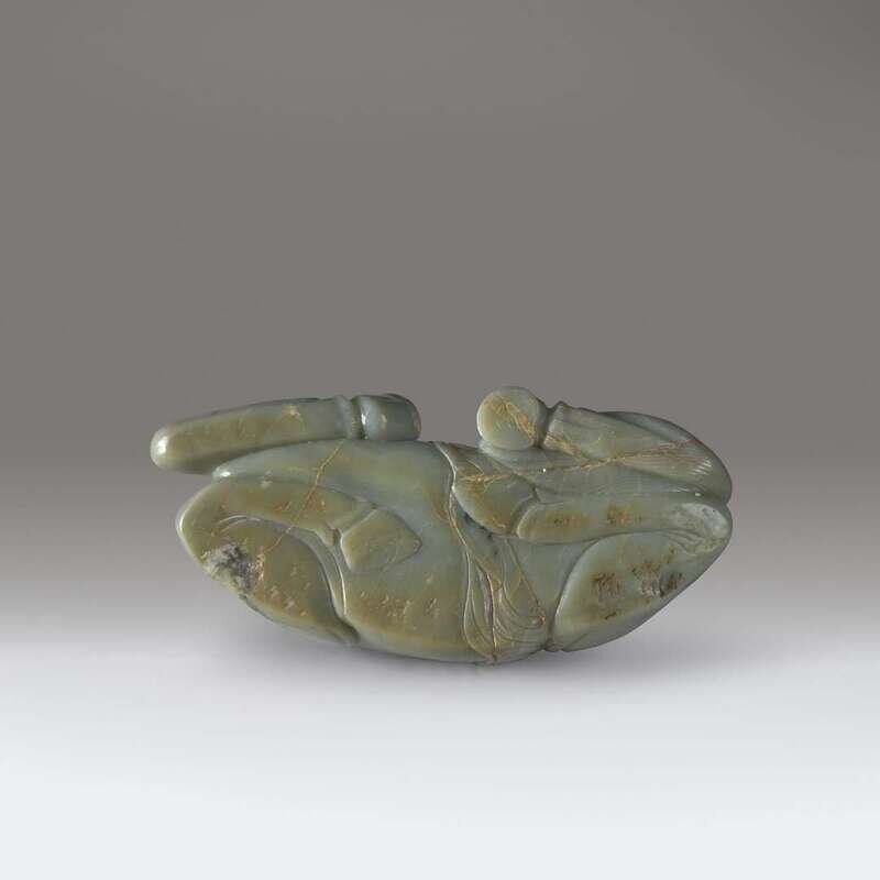 Modeled with legs tucked under, the head turned back, grasping a ribbon which drapes over its back, the stone of a pale ceadon with veins of mottled white and grey.