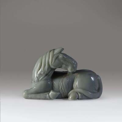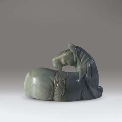 A massive Chinese carved celadon jade carving of a recumbent horse 20th century