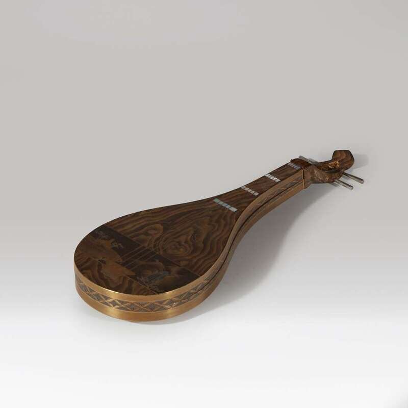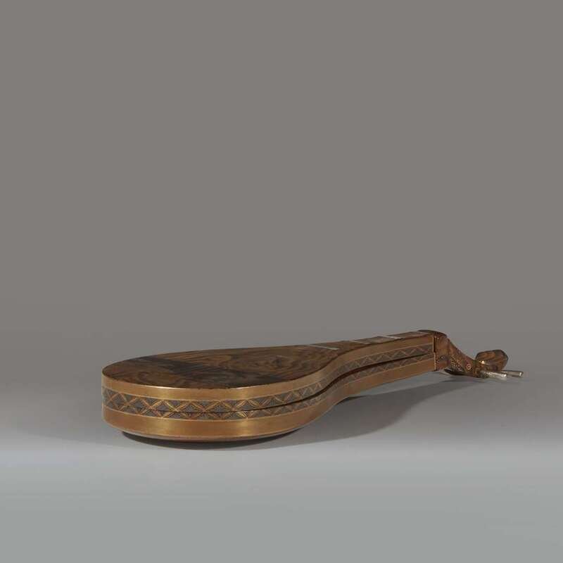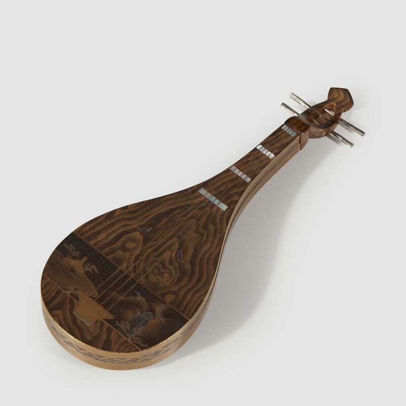 A Japanese lacquered and mother of pearl-inlaid box and cover in the form of a biwa instrument