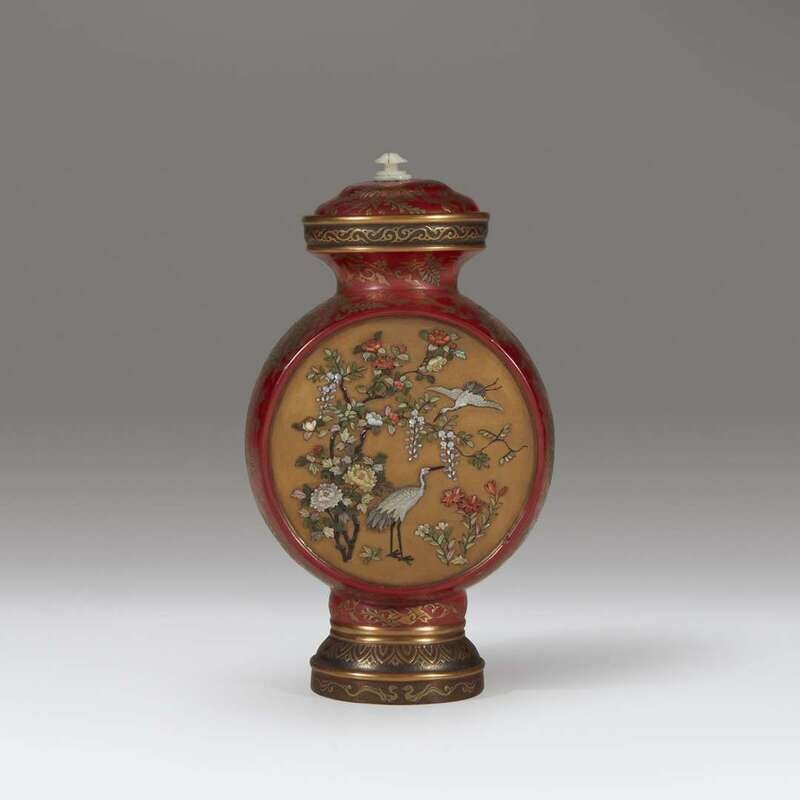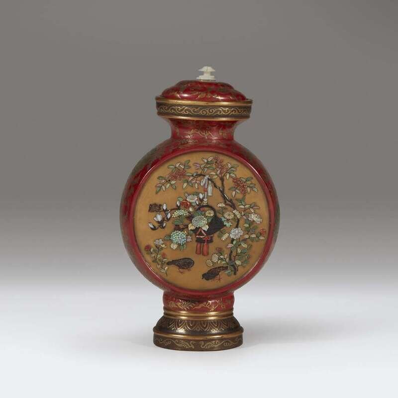 The body decorated to one side with a pair of cranes among flowering branches; the other side with two birds beneath a hanging basket and flowering branches, the cover with a carved mother of pearl finial.
