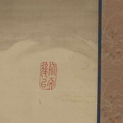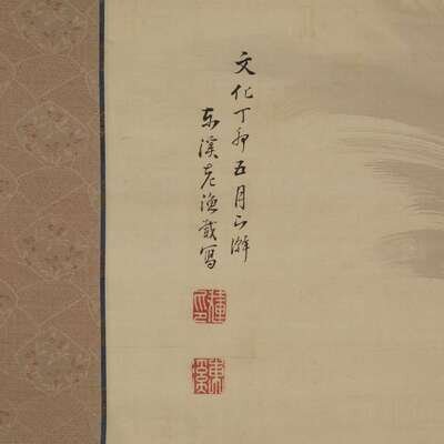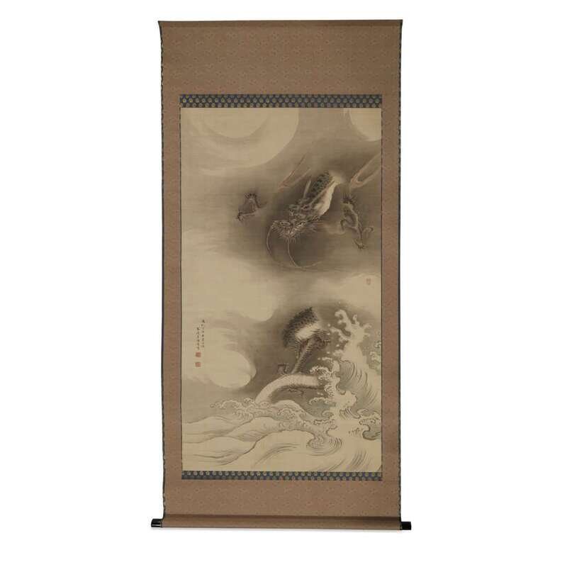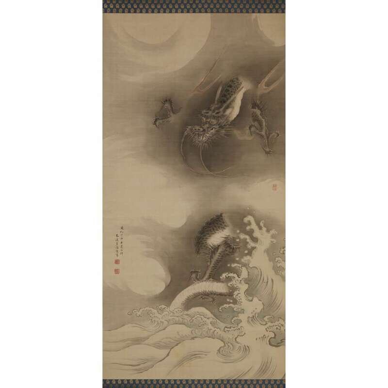 DRAGON IN CLOUDS ABOVE CRASHING WAVES ink and color on silk, inscribed and with two seals lower left, another seal center right, mounted as a hanging scroll.