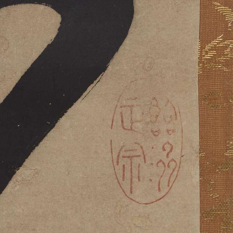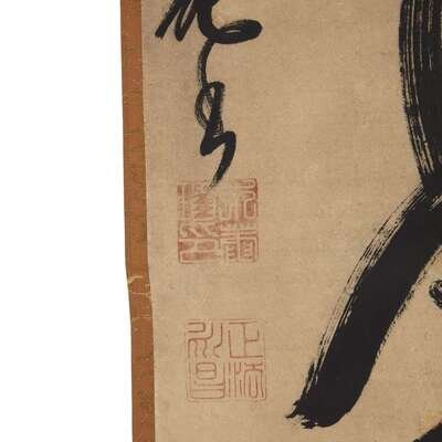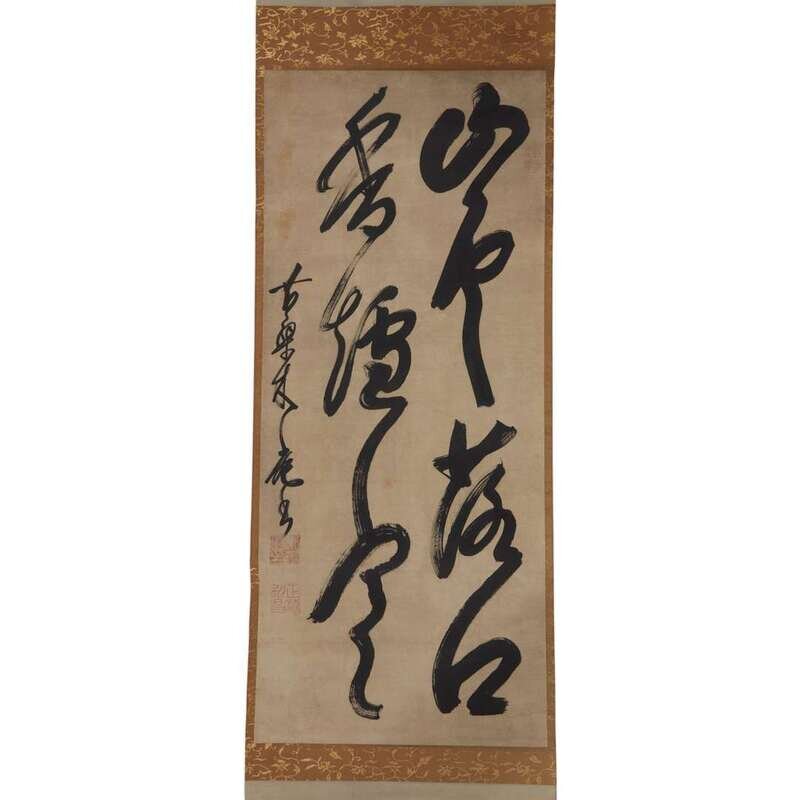 CALLIGRAPHY IN RUNNING STYLE Ink on paper, inscribed on the left, with two seals, a third seal upper right, mounted as a hanging scroll, inscribed Japanese wood box.