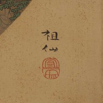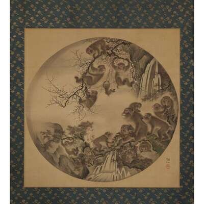 MONKEYS AT PLAY Ink and color on silk, the circular image in rectangular field, inscribed and with seal to lower right of mount, mounted as a hanging scroll, together with a Japanese wood box and a larger lacquered wood box.