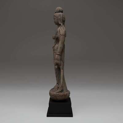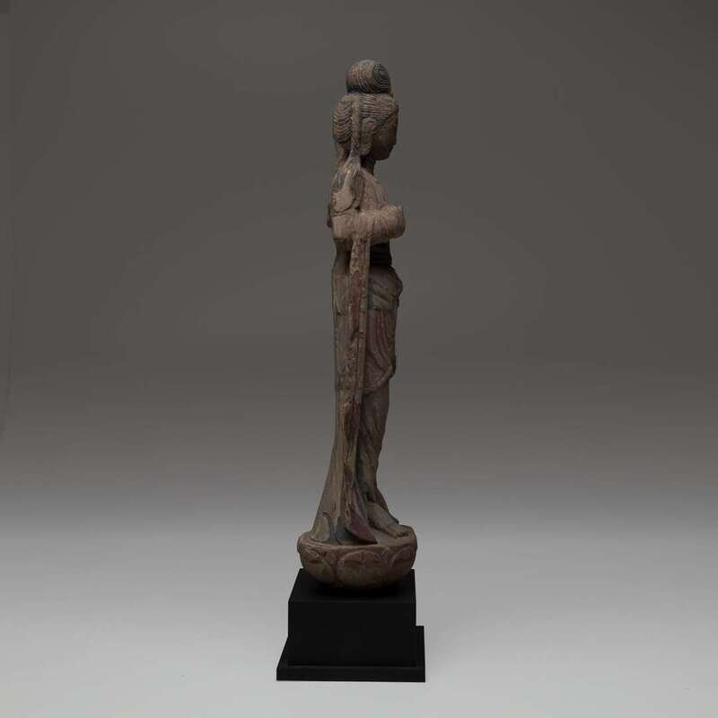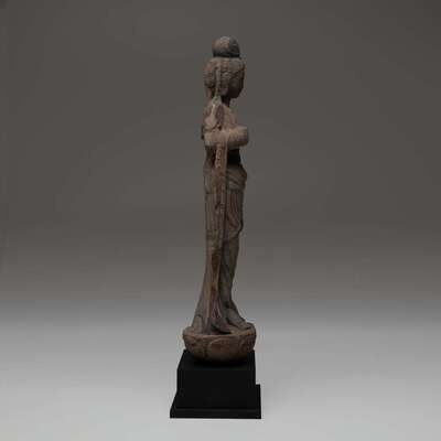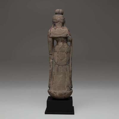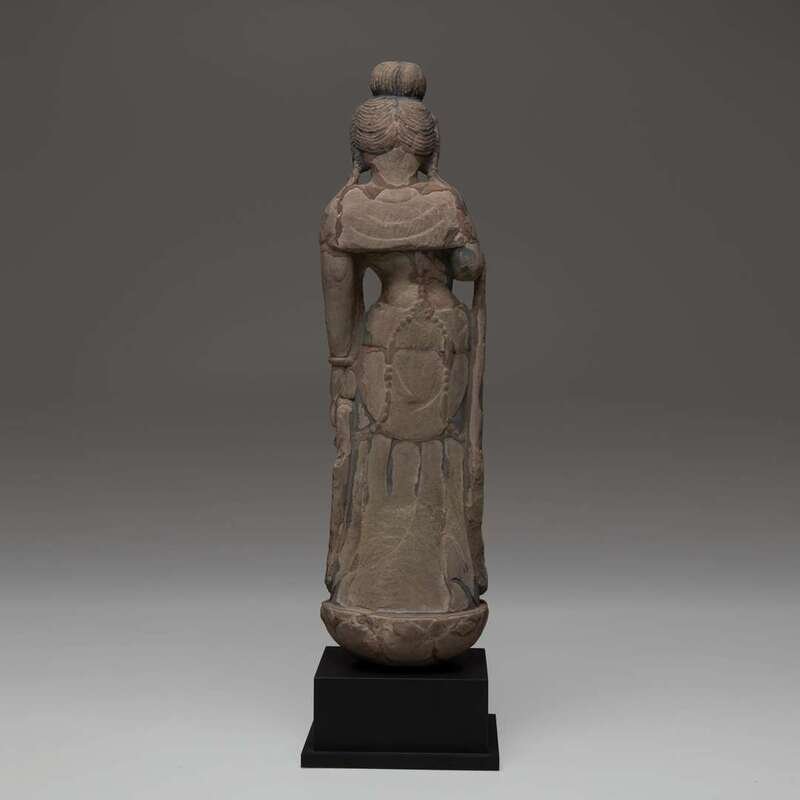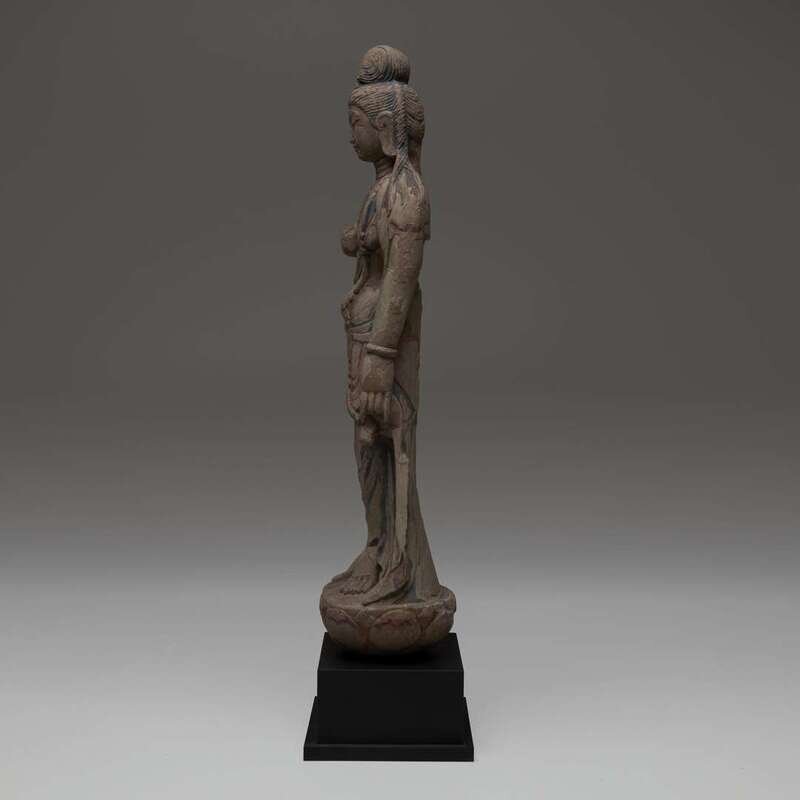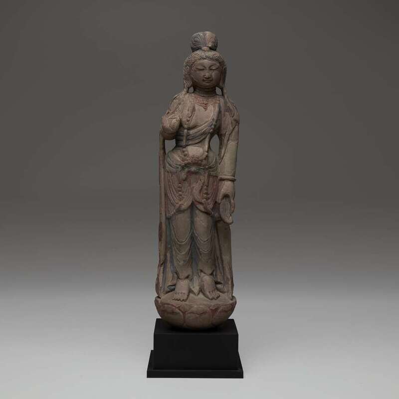 Depicted standing in a slight "thrice-curved" posture upon an open lotus flower with right hand raised, the other hand lowered and lightly lifting a draped sash, the full face carved with arched brows sweeping above gently closed eyes, plump lips carved with a clearly defined bowed outline, neck incised with three lines above necklaces, dressed in clinging draperies with trailing scarves, necklaces gathered at the waist with a floral medallion, dhoti carved in cascading folds following the hips, remnants of red, blue, and green pigment to surfaces, modern stand. NOTE: It has been suggested that such sculptures of a buff or pinkish-red sandstone originate in Sichuan province. Compare two sandstone figures from the collection of Robert Hatfield Ellsworth, sold at Christie's, New York, March 20, 2015 lots 761 and 762. The figures are similar in execution and stone, as well as disposition of retained pigments and surface. Lot 761, the standing Bodhisattva is most similar in terms of portrayal and scale to the present lot.