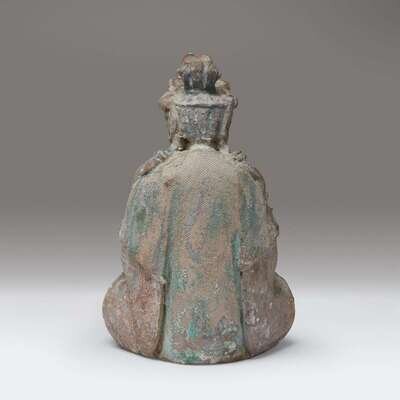 Seated in padmasana, a bowl in clasped hands, with flowing draperies, and elaborate scrolled diadem.