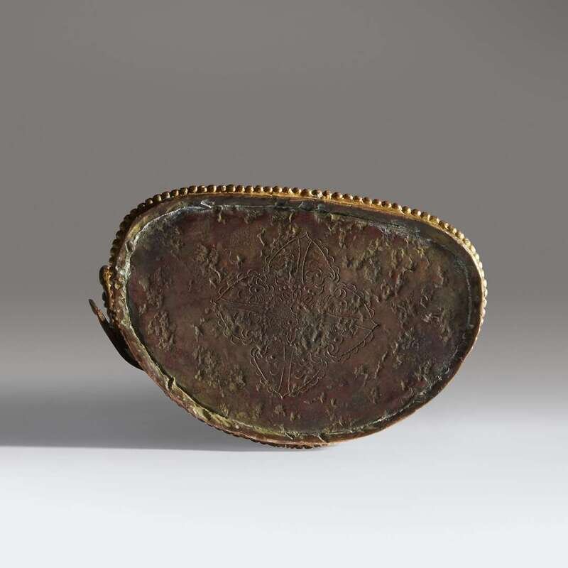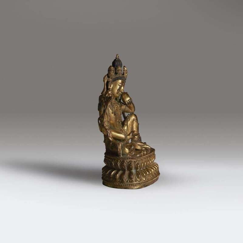 Depicted seated in royal ease atop a double-lotus pedestal with beaded borders, face rendered with a benevolent expression accentuated with lowered eyes and a gentle smile, the pendulous earlobes adorned with ornate wheel-shaped earrings, under an elaborate five-leaved tiara, fine necklaces and scarves draped across the body, flanked by multi-stemmed lotus, baseplate incised with a double vajra.