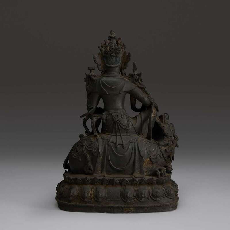 The crowned and bejeweled bodhisattva of Wisdom seated in royal ease, lotus tendrils culminating at the shoulders with a sword and a book, all atop a stylized lion with scrolled tail and bejeweled caparison, the tongue of its open mouth grazing the bodhisattva's pendant fingertips, all on an oval base with a a double row of lotus petals, old dark, crusty surface with traces of gilt lacquer and pigment.