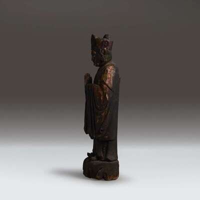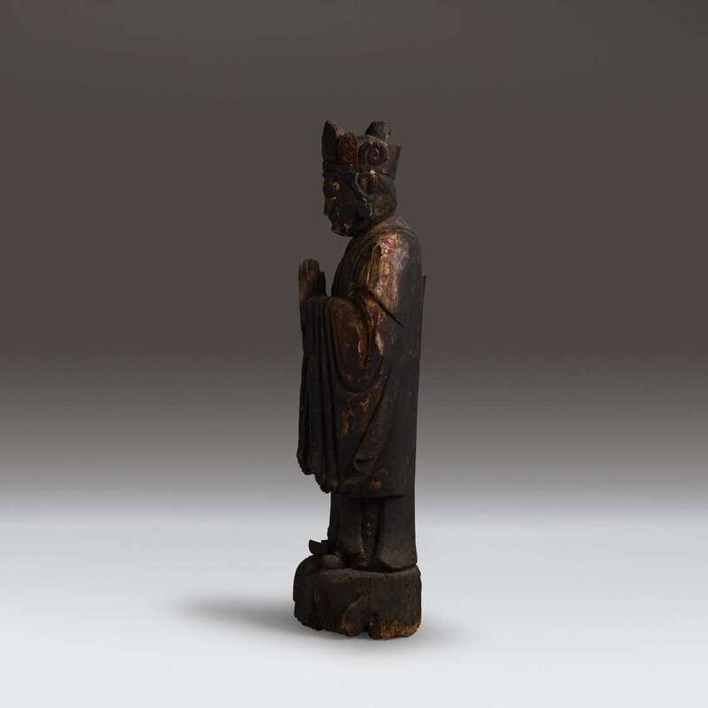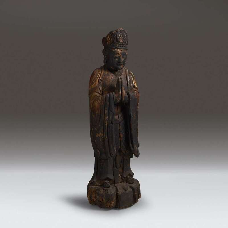 Depicted standing on a rockwork base, hands joined in anjali mudra, wearing a crown centered by a seated figure of Buddha, back with a plugged aperture containing dedicatory materials. Accompanied by a later string of 18 carved wood figural beads.