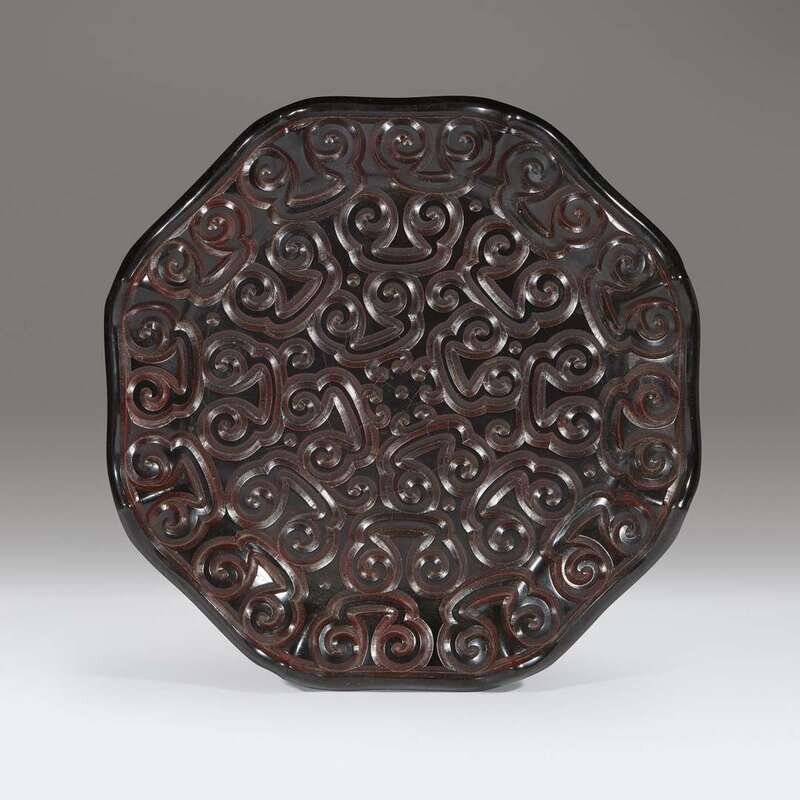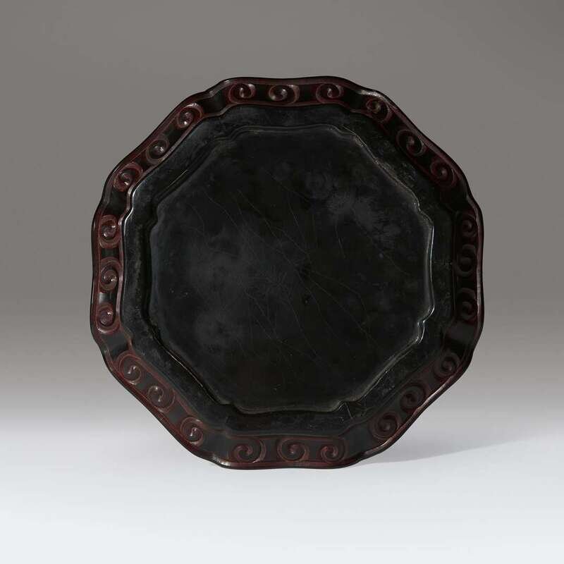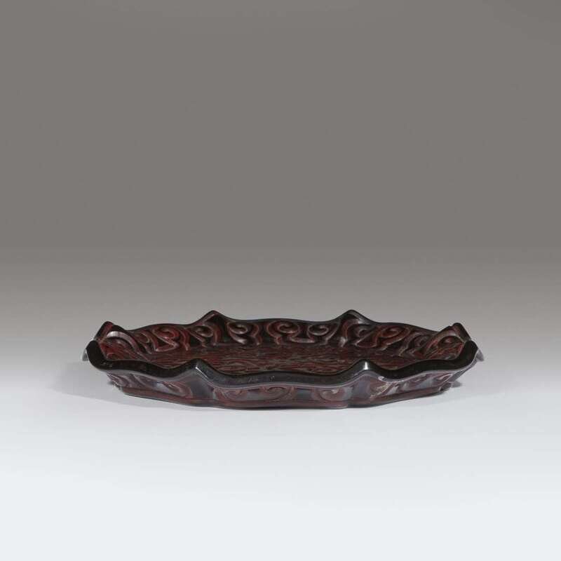Carved in low relief through layers of black and thinly layered cinnabar red lacquer with three bands of ruyi-head scrolls issuing from the central flower head, the exterior is carved with a row of pendent ruyi scrolls, all below a lobed rim.