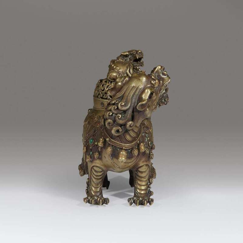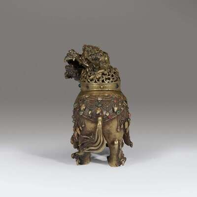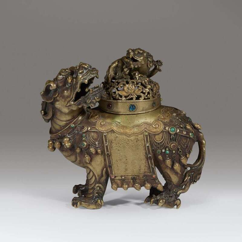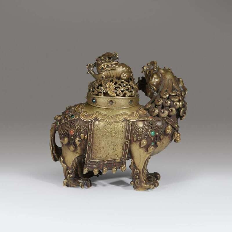 Inset with various colored hardstones and pastes, the lion standing foursquare, adorned in a tasseled lotus-decorated saddle cloth, the lion's mane in tight curls, the tail of sinuous tendrils; the domed cover of pierced lotus scrolls, surmounted by a Buddhist lion finial. NOTE: the prototype for this form of censer is likely to have been created in the Ming dynasty, quite possibly the Xuande reign, given the exuberance of form and elaboration of detail. For another, less refined example, dated to the late Ming dynasty, see the censer from the collection of Ulrich Hausmann, sold at Sotheby's Hong Kong, October 8, 2014, lot 3357. Compare also the Qilin censer, from the same collection, dated to the early Ming dynasty, lot 3351.