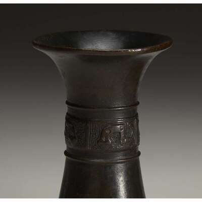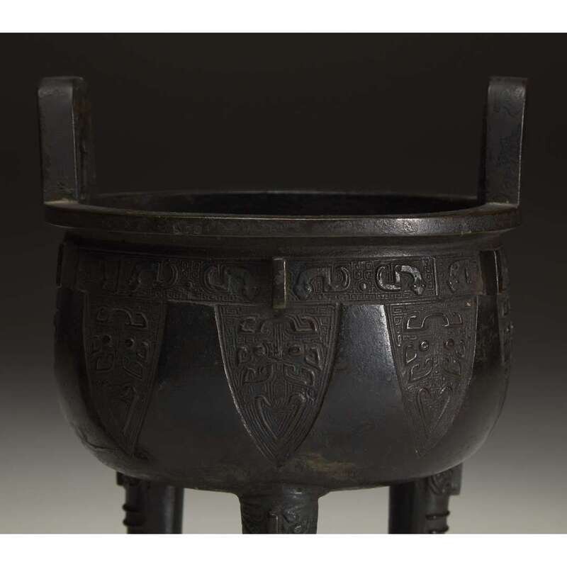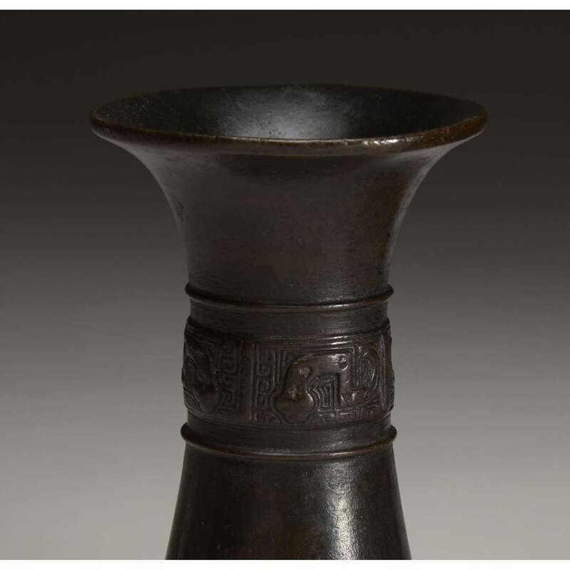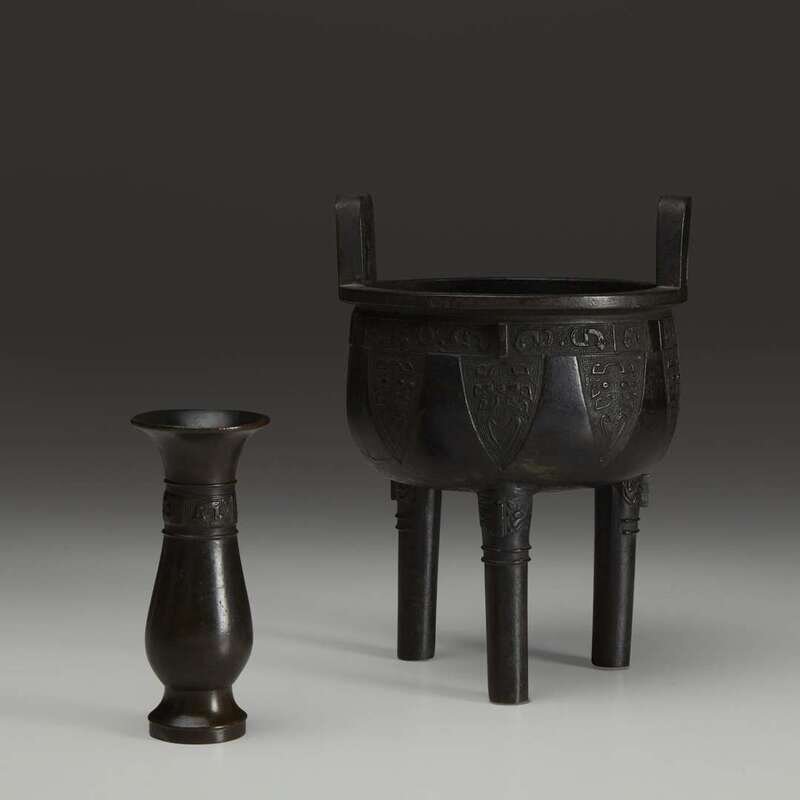 The archaistic circular censer with two vertical U-shaped vertical handles at the lip, raised on three circular legs with flanged taotie masks at the knees, the neck and body molded with stylized "silkworm" border and mask lappets, crusty dark black-brown patina; the vase of elegant vasiform with similar "silkworm" border at the neck, dark brown patina with traces of black.