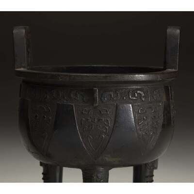 A Chinese patinated bronze tripod censer, Ding, with matched incense tool vase late Ming/early Qing dynasty, 17th/18th century