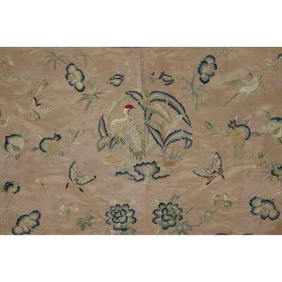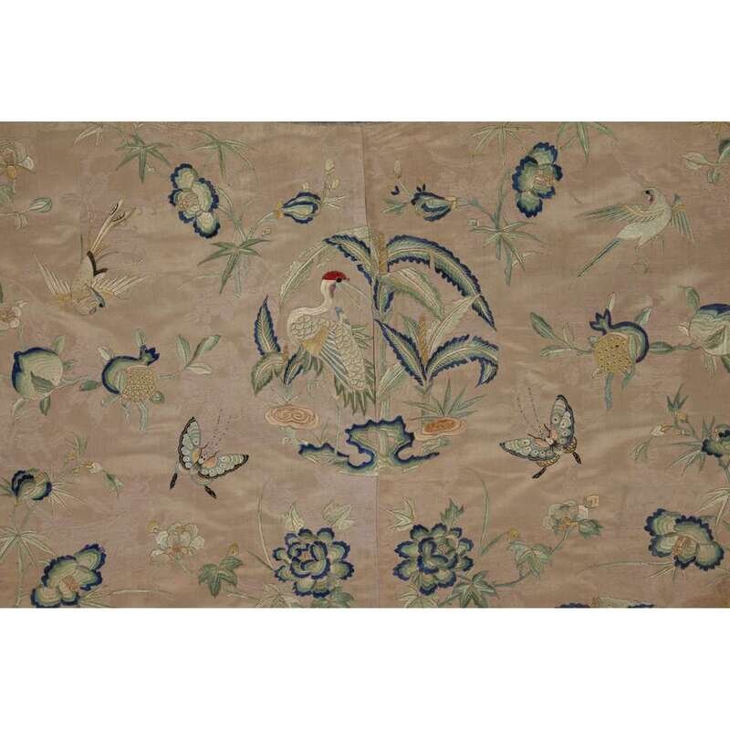 Embroidered with crane and lingzhi roundels, floral sprays and butterflies, on a silk brocade ground figured with auspicious fruits and flowers.