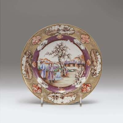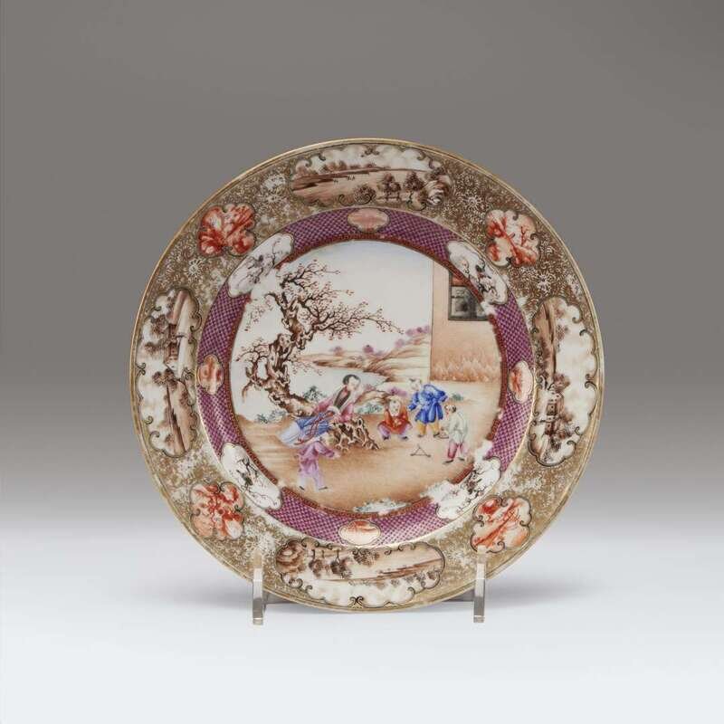 Decorated with figures in a landscape, the first depicting archers practicing, the second depicting children playing in front of a meiren in a garden, the rims with intricate gilt borders of small landscapes painted in sepia (2).