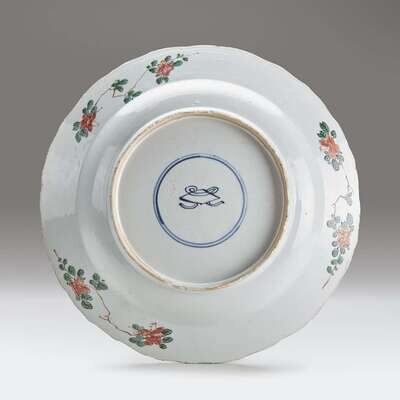 With a lobed rim decorated with reserves of scholarly objects and flowers, the interior painted with branches and peonies, the underside of the rim painted with floral sprays, raised on a shallow footring, the underside with a mark in underglaze blue.