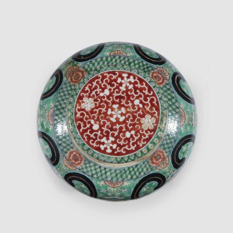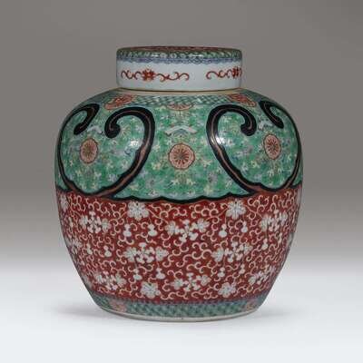 Decorated in two bands around the body, one above with chrysanthemums and chimes on pale green ground surrounded by leaves, the lower with flowers and gourds among scrolling vine left white on iron red ground, bordered on shoulder and foot with a geometric diaper punctuated by florets.