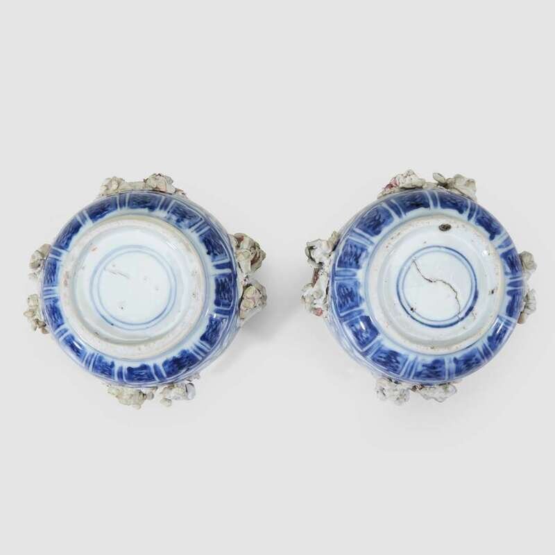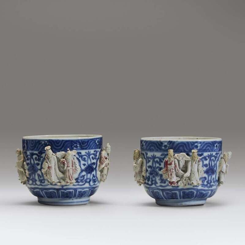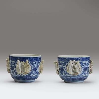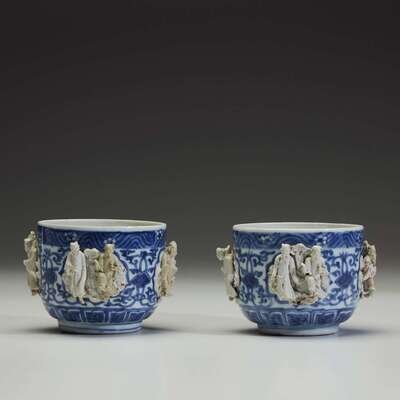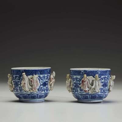 Decorated with underglazed floral motifs between molded biscuit figures in pairs around the exterior of the vessel, each grouping representing two of the eight Daoist Immortals with their attributes, floral and scroll border at lip, lotus lappets at the base (2). NOTE: for a larger bowl with cover, see Christiaan Jorg and Jan van Campen, "Chinese Ceramics in the Collection of the Rijksmuseum, Amsterdam, the Ming and Qing Dynasties, London, 1997, p. 49, no. 31.