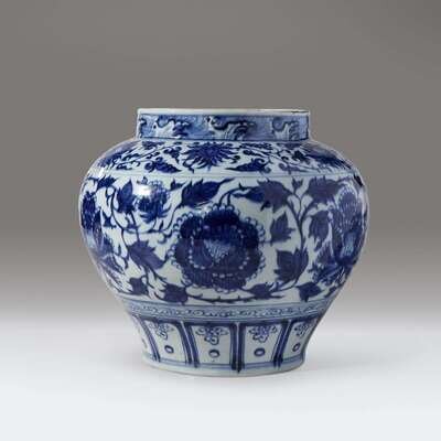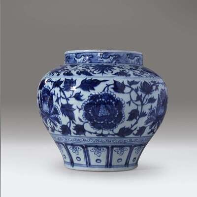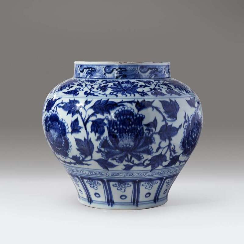 Robustly potted, with a nearly vertical collar and slightly rolled lip, over a broad, swelling shoulder and tapering base, decorated in a rich, deep blue, punctuated by areas of "heaping and piling", the main band of alternating peonies among foliate scrolls, below a band of spiky-petaled lotus blossoms among further foliate scrolls with lobed and scrolled leaves, below a wave-pattern border at the neck, the foot with broad vertical lappets below a narrow band of classic scroll.