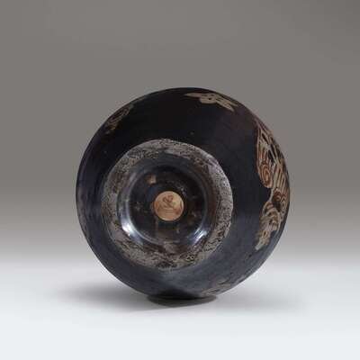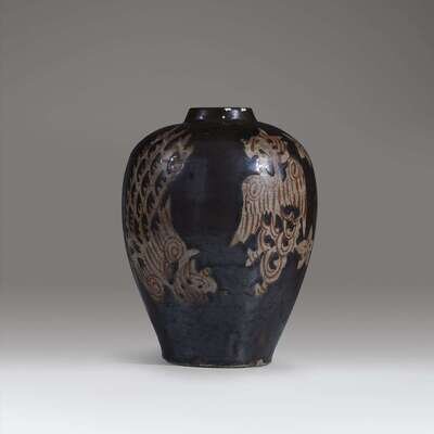 Of ovoid form with two pairs of resist/papercut-decorated phoenix and two pairs of florets, with additional iron-brown details, against a ground of thick brown glaze. NOTE: For a larger example, with complete neck, decorated with florets and phoenix, see the example sold at Sotheby's, New York, March 17, 2015, lot 181.